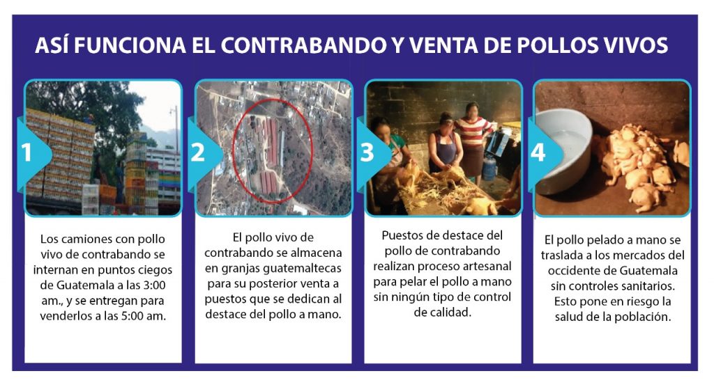 El pollo de contrabando, además, pone en riesgo la salud de la población guatemalteca, debido al manejo del producto vivo que se transporta en condiciones insalubres, así como por el proceso artesanal de pelado que carece de controles de calidad.