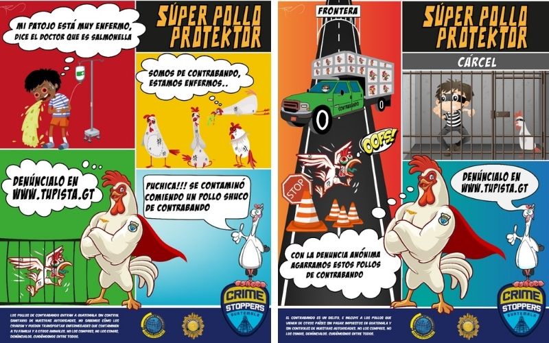 Para impulsar la difusión de por qué es importante evitar el consumo de pollo vivo de contrabando, y para que la población conozca qué puede hacer para denunciar este delito se realizó el lanzamiento de la campaña Súper Pollo Protektor. Esta tiene como objetivo difundir de forma amigable, las implicaciones que el consumo de pollo vivo de contrabando tiene para la salud. Además, hace un llamado a la denuncia anónima de este delito a través del call center de Crime Stoppers 1561 y en www.tupista.gt